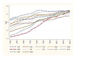 Τι βλέπουμε εδώ; Α χα! Ότι η διαβόητη μεγάλη αύξηση του μοναδιαίου κόστους εργασίας του ευρωπαϊκού Νότου (κόκκινη γραμμή) αντιπροσωπεύει στην πραγματικότητα αύξηση του αποπληθωριστή (πράσινη γραμμή) και όχι του μεριδίου των εργαζομένων (μπλε γραμμή). Στην πραγματικότητα, κατά την επίμαχη περίοδο το μερίδιο των εργαζομένων έχει μειωθεί προς όφελος του κεφαλαίου σε 9 χώρες της ΕΕ, μεταξύ των οποίων η Ιταλία και η Ισπανία, έχει παραμείνει σταθερό στην Πορτογαλία και έχει αυξηθεί μόνο στην Ελλάδα. Προσοχή, όμως, σημειώνουν οι συγγραφείς: ούτε η εξαίρεση της αύξησης του μεριδίου εργασίας στην Ελλάδα λέει πολλά πράματα διότι η Ελλάδα ξεκίνησε το 1980 από πολύ χαμηλά: από το χαμηλότερο μερίδιο εργασίας όχι απλά στην Ευρώπη των 12 αλλά και στο σύνολο των χωρών του ευρωπαϊκού Νότου, οπότε ήταν εύλογο να κινηθεί ψηλότερα.